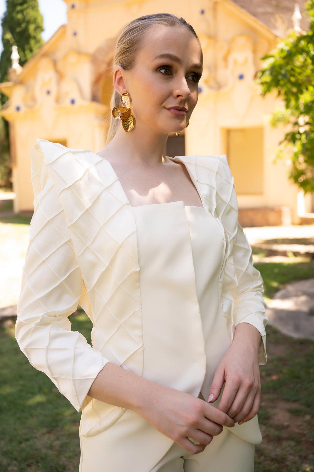 Conjuntazo con aretas confeccionadas a mano, fabricación nacional , ideal para invitadas y mamá de comunión o bautizo, lleva además botones bordados a mano dorados para quien guste colocarlos a modo decorativo en el top ya que se abre con broches, la elegancia la tendrás garantizada