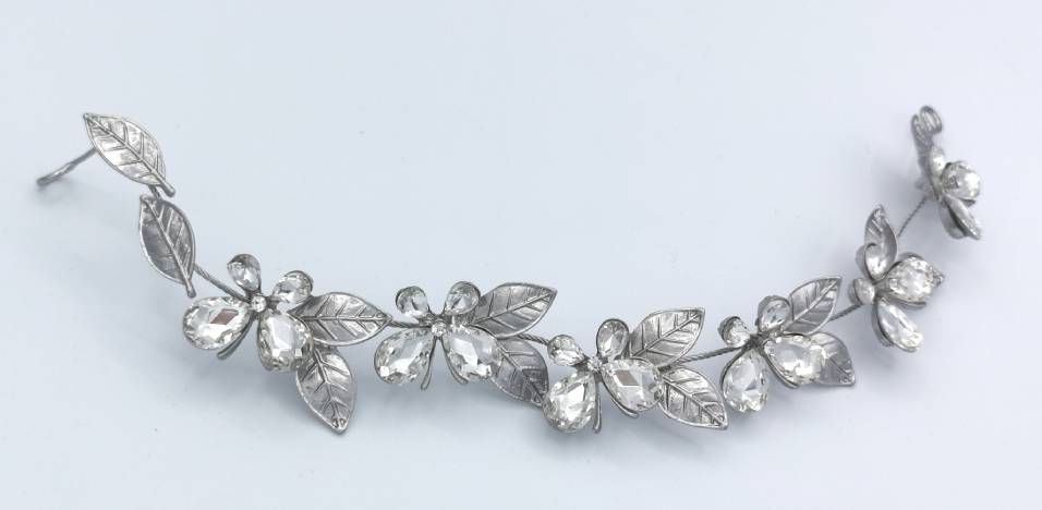 Metal y cristales, maleable completamente para que puedas añadirla a tu peinado con la forma que desees o mejor se adapte a él, ésta es plata vieja, pero también las puedes adquirir en plata y el dorado. Mira otros modelos disponibles