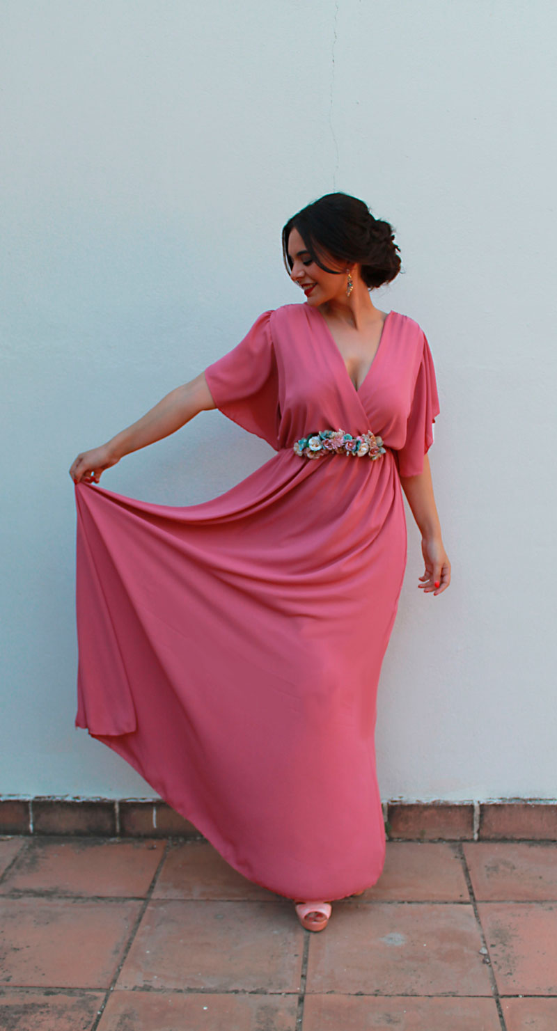 Vestido básico de talla única, (38 a 44) cruce de escote y elástico en la cinturilla falda de capa, media manga de volante. Ideal para combinar con cinturón de flores y con muchas posibilidades. Ideal si quieres disimular barriguita, estás embarazada, o dando el pecho gracias a su escote.